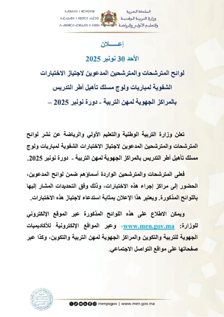وجاء الإعلان الرسمي الصادر يوم الأحد 30 نونبر 2025 ليؤكد نشر لوائح المترشحات والمترشحين المدعوين لاجتياز الاختبارات الشفوية الخاصة بمسالك تأهيل أطر التدريس بالمراكز الجهوية لمهن التربية والتكوين برسم دورة نونبر 2025. ويهدف هذا المقال إلى تقديم قراءة واضحة وشاملة حول مضمون هذا الإعلان، وأهميته، والمساطر المعتمدة، إضافة إلى تقديم مجموعة من الإرشادات المفيدة للمقبلين على اجتياز هذه المرحلة الحاسمة.