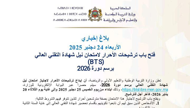 يؤكد بلاغ وزارة التربية الوطنية والتعليم الأولي والرياضة بخصوص فتح باب الترشيحات لاجتياز امتحان نيل شهادة التقني العالي (BTS) برسم دورة 2026 حرص الدولة على دعم التكوين التقني، وإتاحة فرص متكافئة للمترشحين الأحرار وفق ضوابط دقيقة وشفافة.