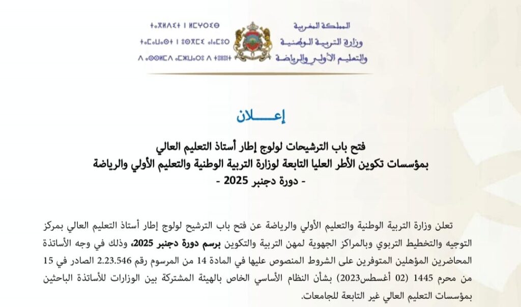 تُعد هيئات تكوين الأطر العليا ركيزة أساسية في تطوير المنظومة التعليمية بالمغرب، لما لها من دور محوري في إعداد وتأهيل الأطر التربوية والإدارية القادرة على الإسهام في تجويد التعليم والرفع من جودته. وفي هذا السياق، أصدرت وزارة التربية الوطنية والتعليم الأولي والرياضة إعلاناً رسمياً يتعلق بفتح باب الترشيحات لولوج إطار أستاذ التعليم العالي بمؤسسات تكوين الأطر العليا، وذلك برسم دورة دجنبر 2025.