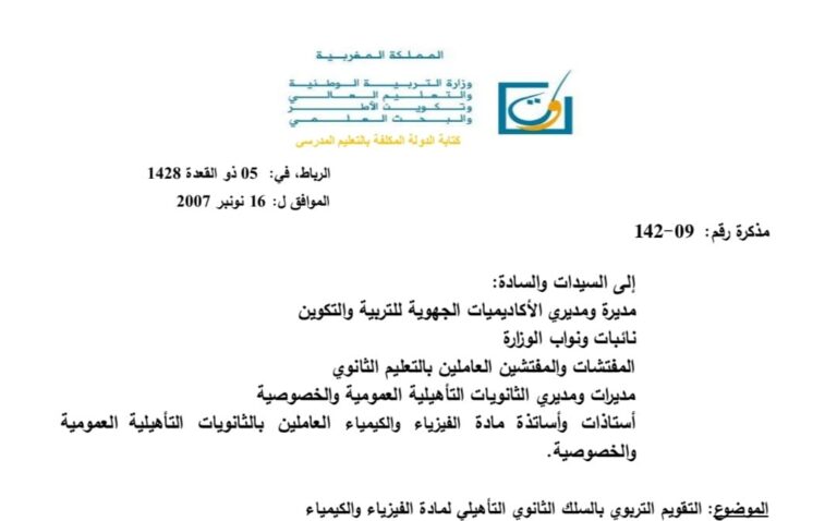 مذكرة التقويم التربوي لمادتي الفيزياء والكيمياء بالسلك الثانوي التأهيلي