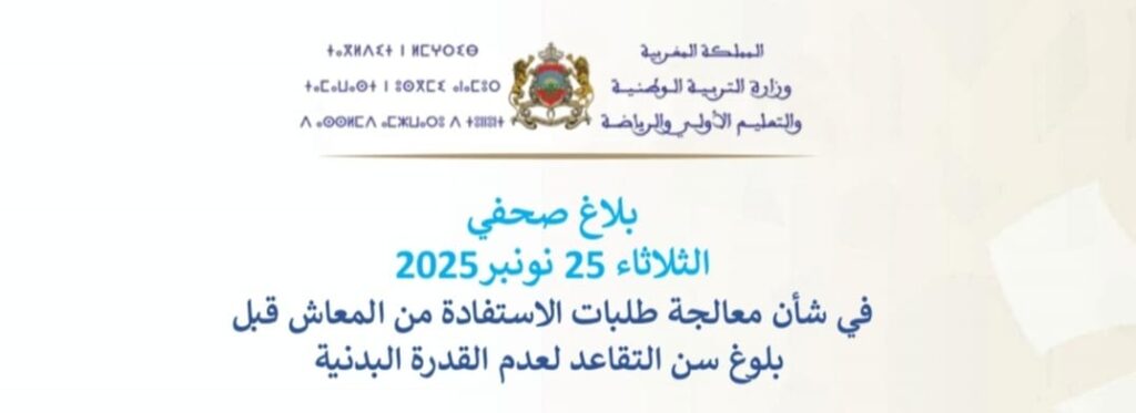 تعمل وزارة التربية الوطنية والتعليم الأولي والرياضة على توفير مجموعة من الخدمات الاجتماعية لفائدة موظفاتها وموظفيها، ومن بين أهم هذه الخدمات إمكانية الاستفادة من المعاش قبل بلوغ سن التقاعد القانوني بسبب عدم القدرة البدنية. وقد أصدرت الوزارة بلاغاً رسمياً يوضح الإجراءات الخاصة بمعالجة طلبات الاستفادة، وسلط الضوء على الخطوات التي يجب اتباعها والوثائق المطلوبة والآجال المحددة.